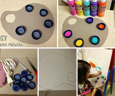 - Σχημάτισε από το πατρόν μία παλέτα, κόψε στο περίγραμμα και κόλλησε τα καπάκια πάνω της. Γέμισε τα καπάκια με χρώματα! Η παλέτα σου είναι έτοιμη!